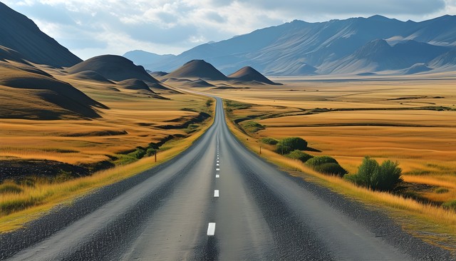 辽阔的公路穿过壮丽的山脉和平原,蓝天白云相映,展现自然的壮观之美。