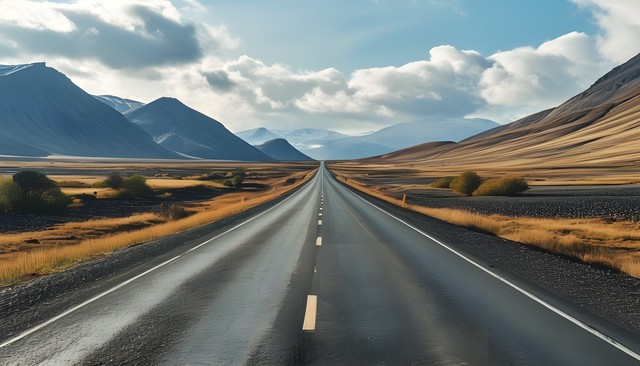 辽阔的公路穿过壮丽的山脉和平原,蓝天白云相映,展现自然的壮观之美。