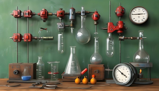 精致的复古实验器材,展示了各种机械和仪器工具。