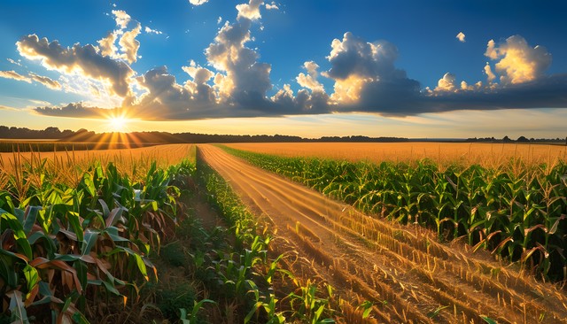 蓝天白云与丰收的玉米田相映成趣,展现自然之美。