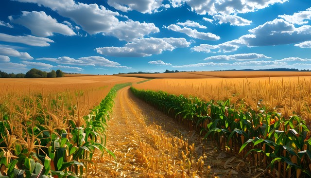 蓝天白云与丰收的玉米田相映成趣,展现自然之美。
