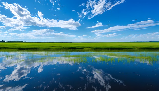 辽阔的田野与蓝天白云交相辉映,展现自然的宁静之美。