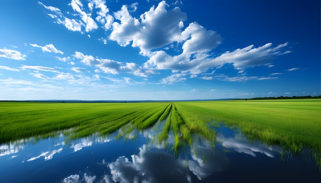 辽阔的田野与蓝天白云交相辉映,展现自然的宁静之美。