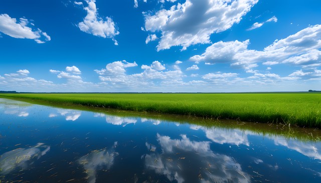 辽阔的田野与蓝天白云交相辉映,展现自然的宁静之美。
