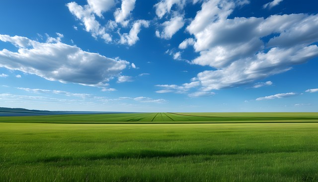 辽阔的田野与蓝天白云交相辉映,展现自然的宁静之美。