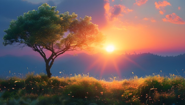 日落时分,温暖的阳光洒在盛开的花海和孤独的树上,营造出宁静的自然景象。