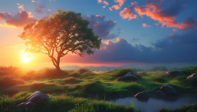 日落时分,温暖的阳光洒在盛开的花海和孤独的树上,营造出宁静的自然景象。