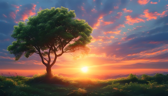日落时分,温暖的阳光洒在盛开的花海和孤独的树上,营造出宁静的自然景象。