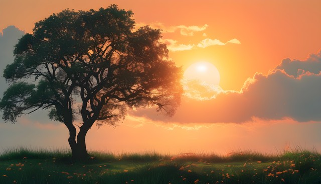 日落时分,温暖的阳光洒在盛开的花海和孤独的树上,营造出宁静的自然景象。