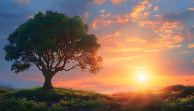 日落时分,温暖的阳光洒在盛开的花海和孤独的树上,营造出宁静的自然景象。