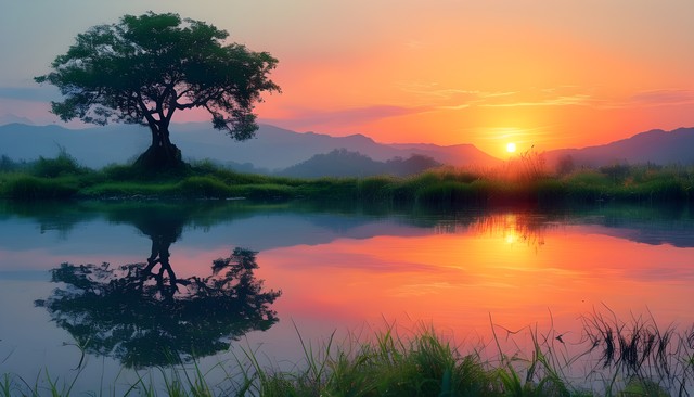日落时分,温暖的阳光洒在盛开的花海和孤独的树上,营造出宁静的自然景象。