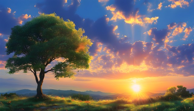 日落时分,温暖的阳光洒在盛开的花海和孤独的树上,营造出宁静的自然景象。