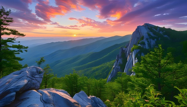 日出时分,郁郁葱葱的山脉与岩石,展现出自然的壮丽景色。