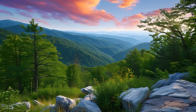 日出时分,郁郁葱葱的山脉与岩石,展现出自然的壮丽景色。
