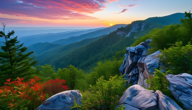 日出时分,郁郁葱葱的山脉与岩石,展现出自然的壮丽景色。