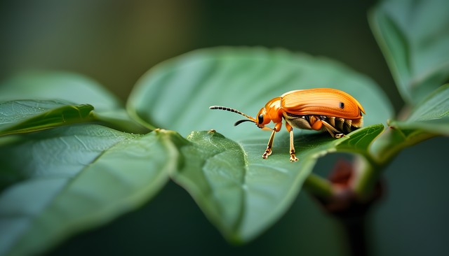 一只栖息在绿叶上的橙色小甲虫,周围环境宁静自然。