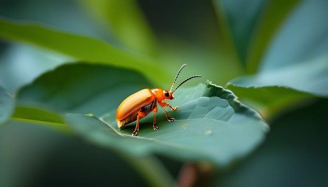 一只栖息在绿叶上的橙色小甲虫,周围环境宁静自然。