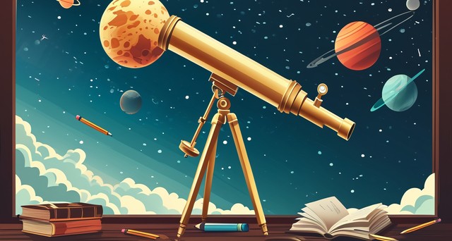 天文学概念。望远镜,行星,书,铅笔。观察天空。矢量漂浮物,文本位置。天文台、天文馆、教育旅游的广告