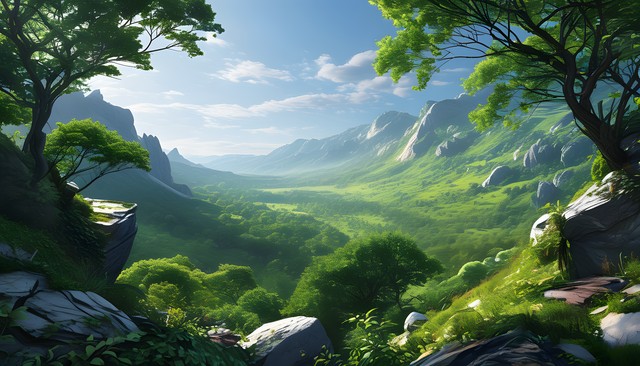 郁郁葱葱的山谷景色,树木和岩石交融,展现自然之美。