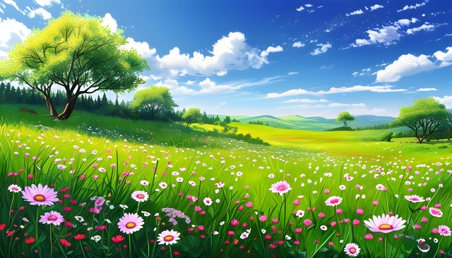 春天的草原上生机盎然,绿草如茵,点缀着小花,宁静的自然景象。