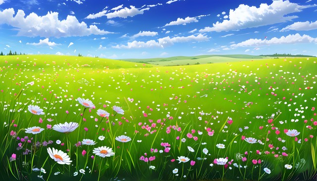 春天的草原上生机盎然,绿草如茵,点缀着小花,宁静的自然景象。