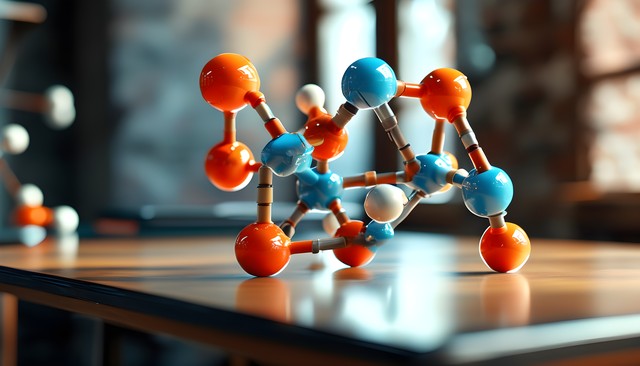 色彩鲜艳的分子模型展示在桌面上,背景模糊,显得现代而科学。