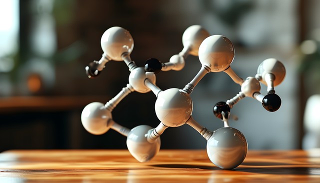 色彩鲜艳的分子模型摆放在木质桌面上,背景模糊,体现科学与探索。