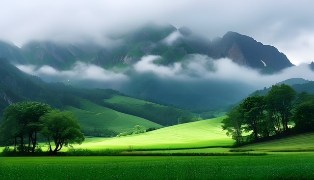 云雾缭绕的山脉与绿色田野交相辉映,展现出如诗如画的自然风光。
