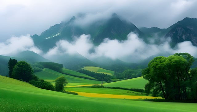 云雾缭绕的山脉与绿色田野交相辉映,展现出如诗如画的自然风光。