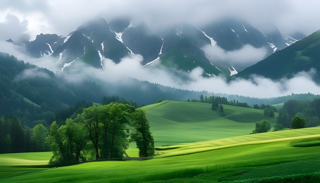 云雾缭绕的山脉与绿色田野交相辉映,展现出如诗如画的自然风光。
