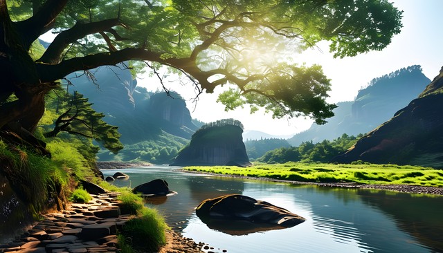 阳光透过山林,映照在宁静的溪流和层叠的山峦上,展现出一幅自然的画卷。