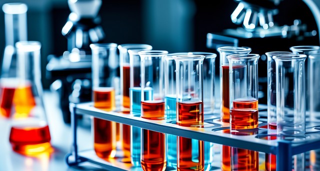 实验室中,试管排列整齐,显微镜下细胞活跃,科学探索的氛围浓厚。