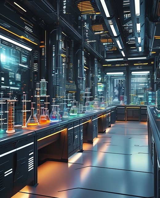 未来感十足的科学实验室,充满各种高科技设备和光影效果。