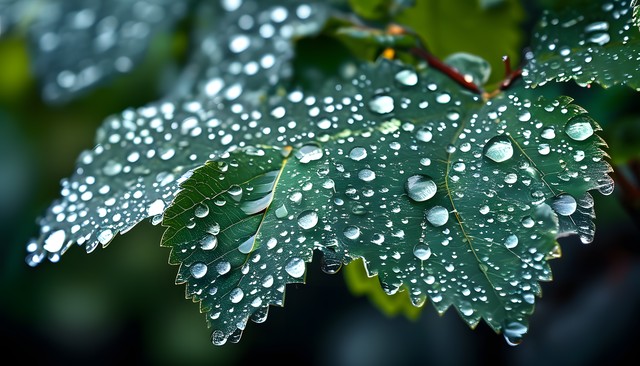 雨后叶子上沾满水珠,展现自然之美。