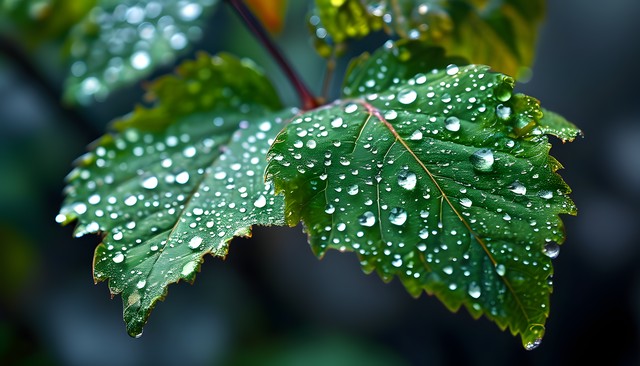 雨后叶子上沾满水珠,展现自然之美。