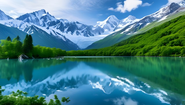 青绿色湖水与巍峨雪山、郁郁葱葱的树林交相辉映,展现自然之美。