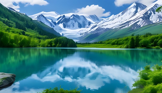 青绿色湖水与巍峨雪山、郁郁葱葱的树林交相辉映,展现自然之美。