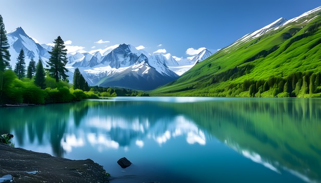 青绿色湖水与巍峨雪山、郁郁葱葱的树林交相辉映,展现自然之美。