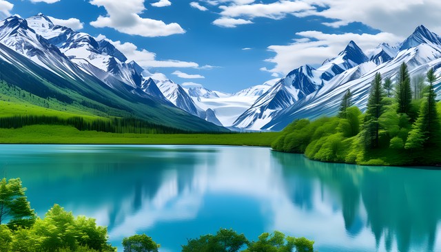 青绿色湖水与巍峨雪山、郁郁葱葱的树林交相辉映,展现自然之美。