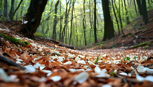 春天的林间,花瓣与落叶交织成美丽的自然画卷。