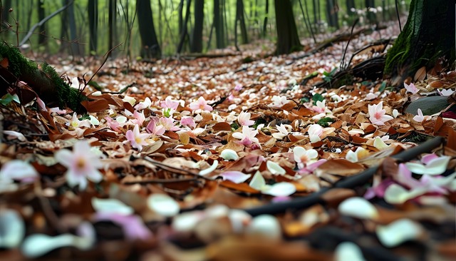 春天的林间,花瓣与落叶交织成美丽的自然画卷。