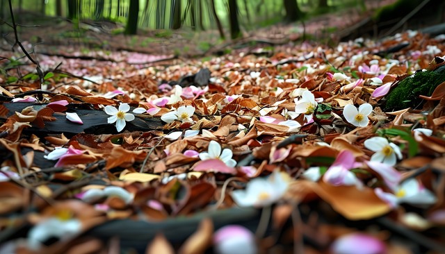 春天的林间,花瓣与落叶交织成美丽的自然画卷。