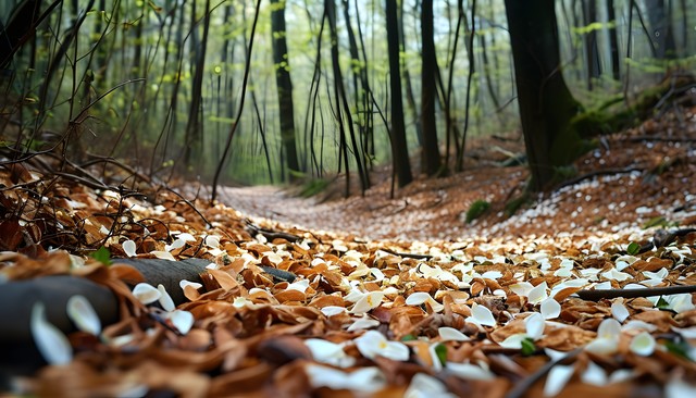 春天的林间,花瓣与落叶交织成美丽的自然画卷。