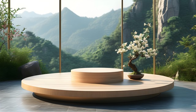 宁静的山水背景,简约圆形台子置于自然美景中,展示和谐与平静。
