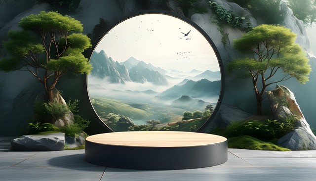 宁静的山水背景,简约圆形台子置于自然美景中,展示和谐与平静。