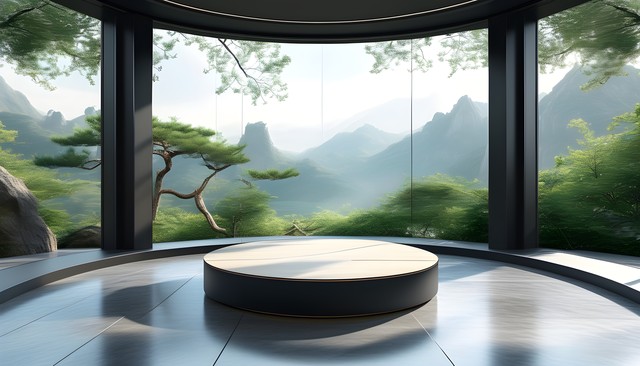 宁静的山水背景,简约圆形台子置于自然美景中,展示和谐与平静。