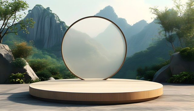 宁静的山水背景,简约圆形台子置于自然美景中,展示和谐与平静。