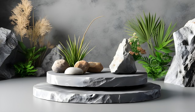 石材平台上摆放着自然元素,展示和谐美丽的室内景观。