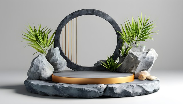 石材平台上摆放着自然元素,展示和谐美丽的室内景观。