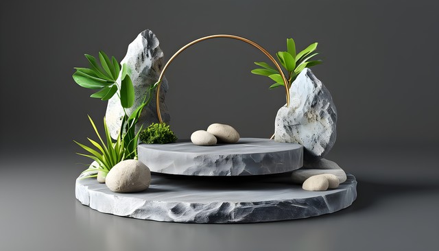 石材平台上摆放着自然元素,展示和谐美丽的室内景观。